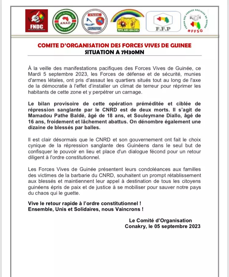 « Le bilan provisoire de cette opération préméditée et ciblée de répression sanglante par le CNRD est de deux morts. Il s’agit de Mamadou Pathé Baldé, âgé de 18 ans, et Souleymane Diallo, âgé de 16 ans, froidement et lâchement abattus. On dénombre également une dizaine de blessés par balles. », précise le communiqué.